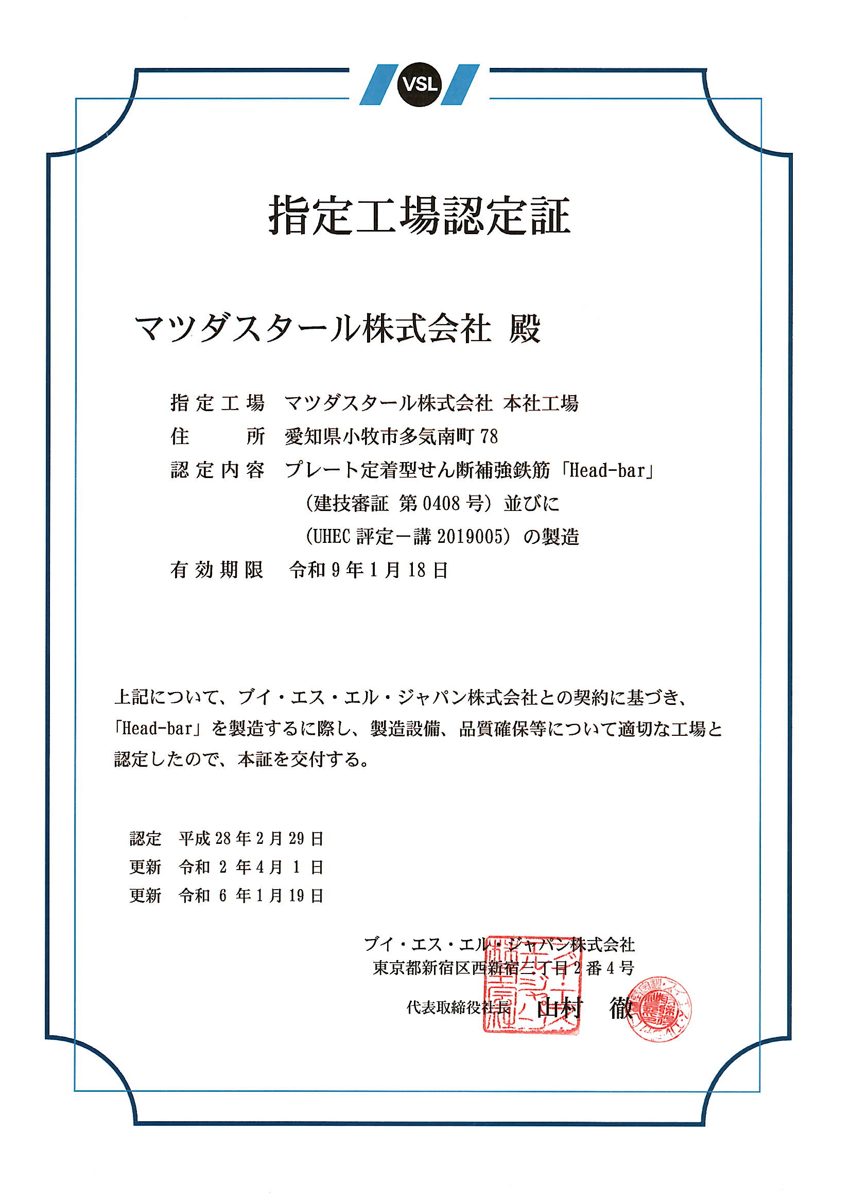 VSL JAPAN株式会社Head-bar指定工場認定証